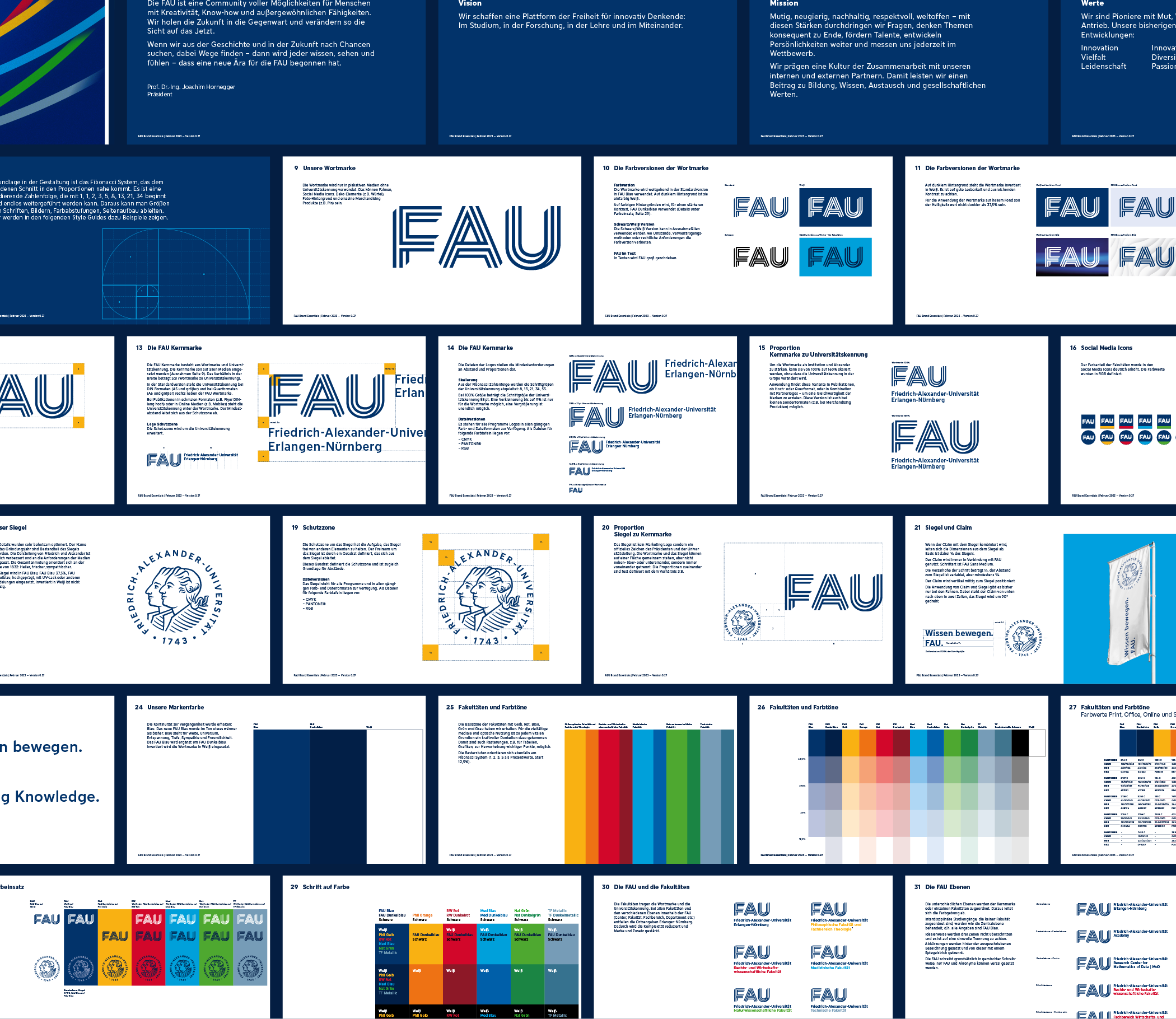 FAU adopts a singular logo in dark blue or white, strengthening the university’s brand. Faculties receive two additional colors: a deep, powerful shade and a vibrant, energetic hue. The Fibonacci Design System guides color variations, sub-brands, and the style guide, ensuring cohesive communication.